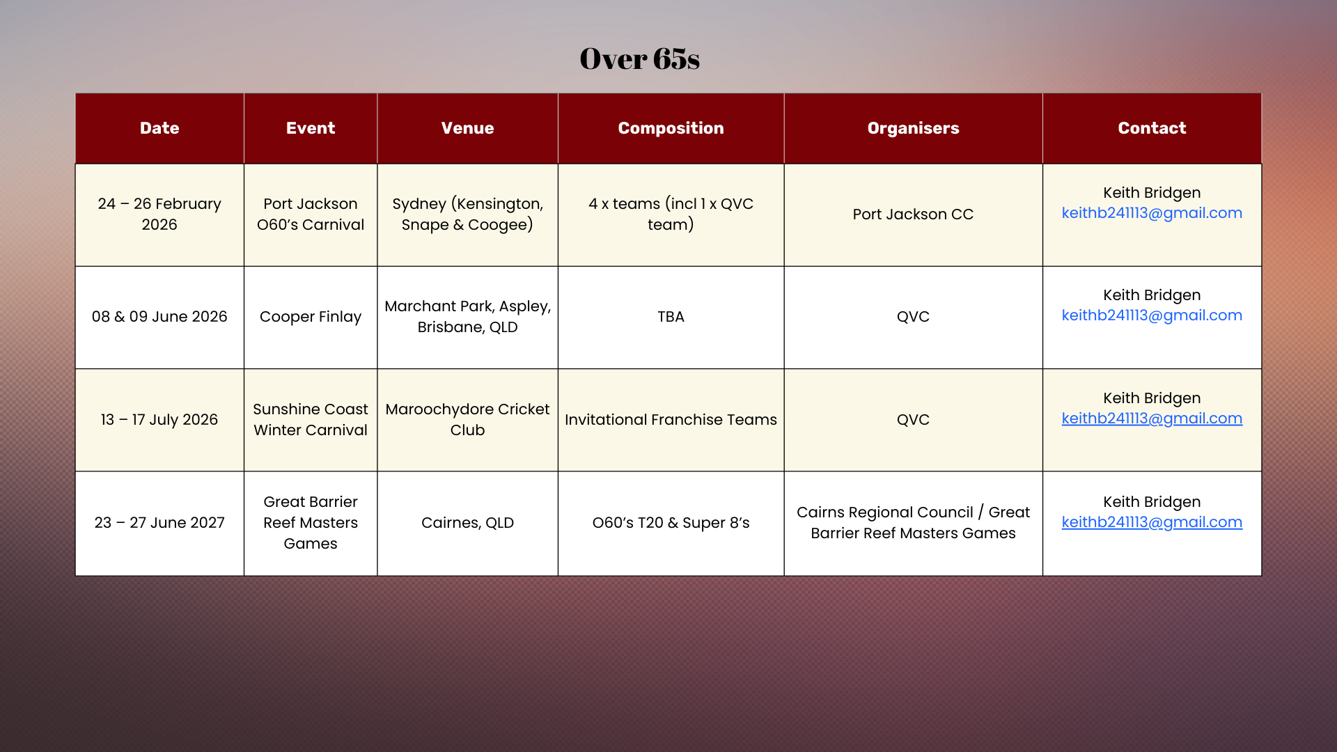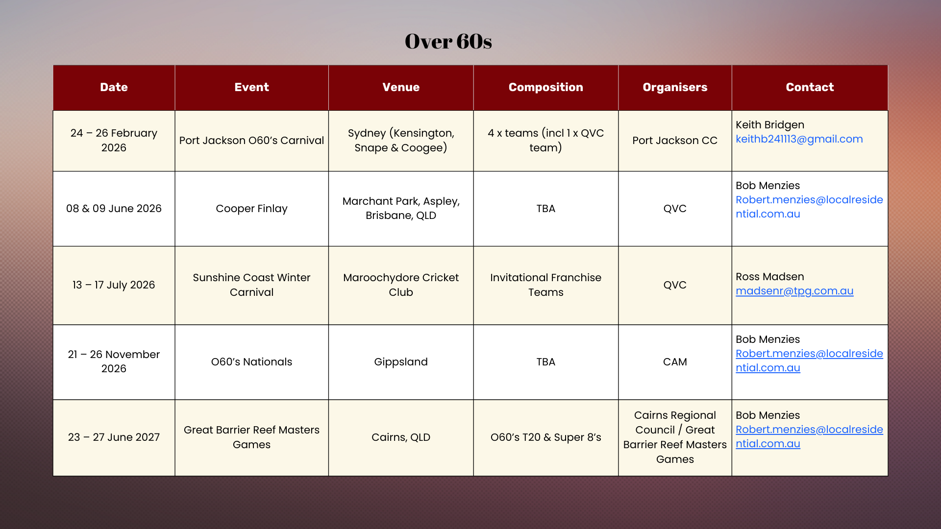 2025/2026 QUEENSLAND VETERANS CRICKET CALENDAR
