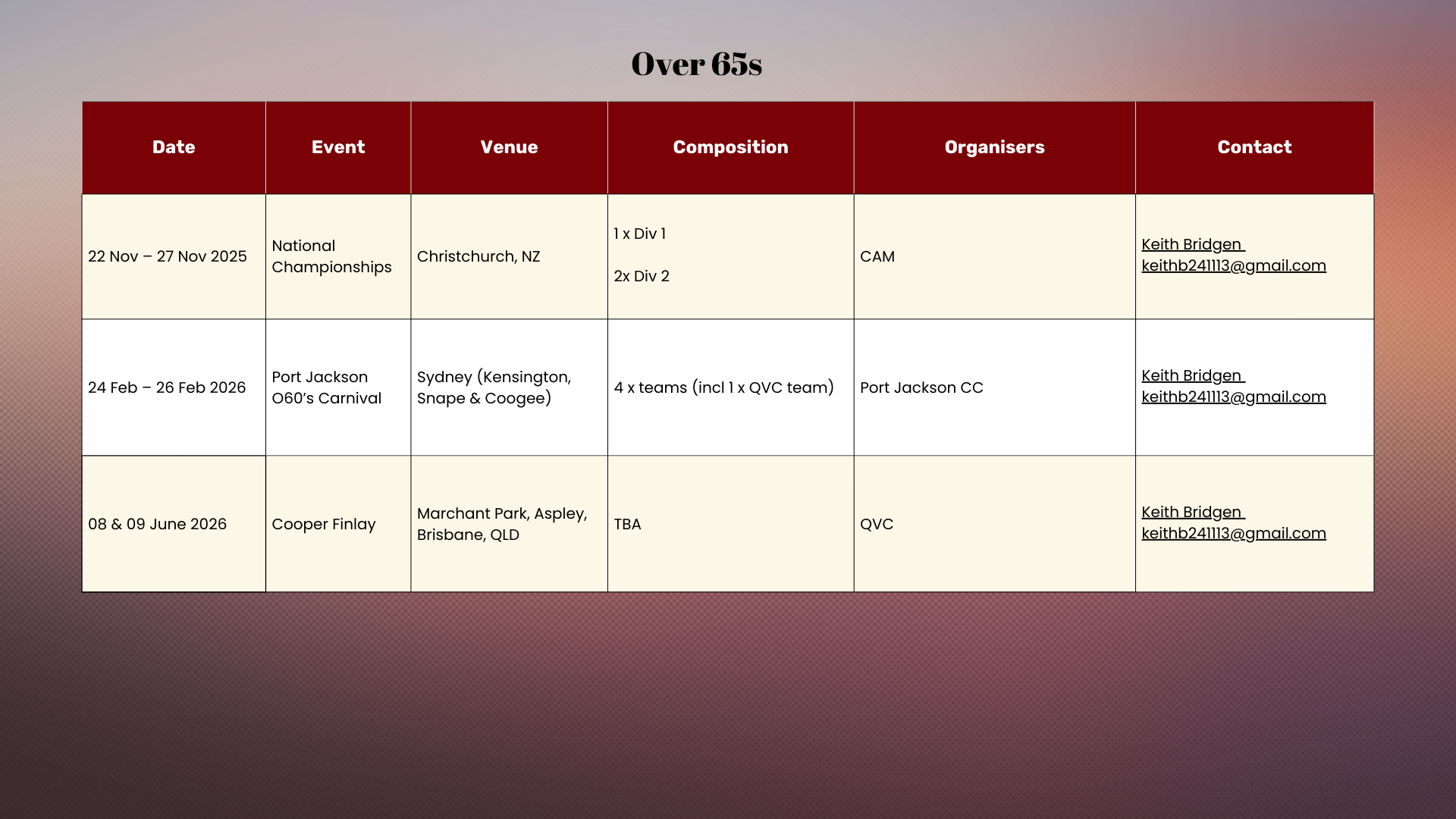 Queensland Veterans Cricket has also been sending teams to the Nationals competitions each year. This includes multiple teams in each age group O40s, O50s, O55s, O60s, O65s, O70s and O75s. These competitions have been held right across Australia and New Zealand with our kiwi neighbours now entering teams into our Nationals competitions. Queensland teams have also travelled to New Zealand for bilateral competitions for specific age groups.