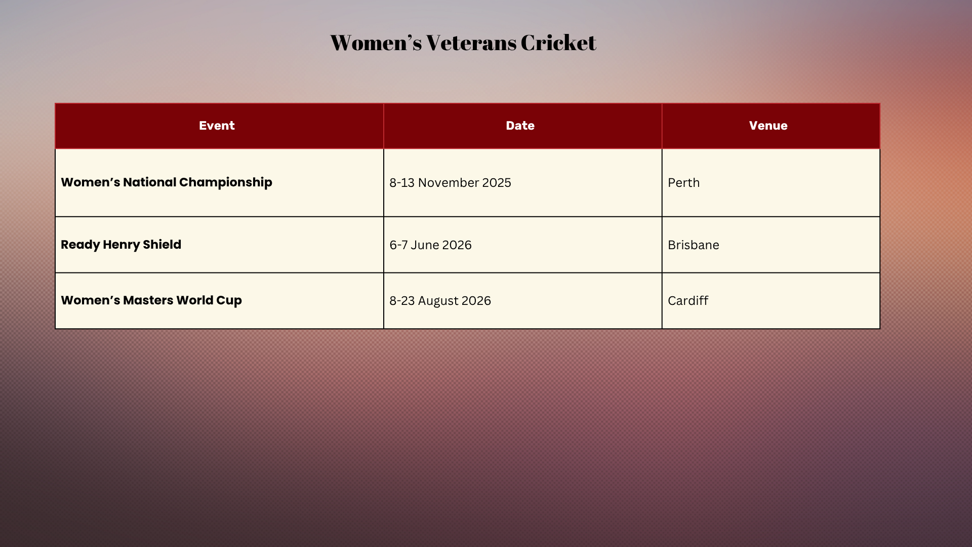 The Cricket Australia Masters Facebook page shows events across Australia and international tours, some of which may also be reflected in the Queensland calendars below.
