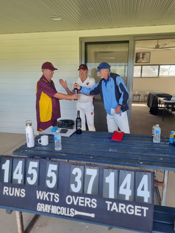 Later in the innings Richard Cannon (Coffs) supported by Terry Herbert showed some attacking flair attacking some of the Qld part time bowlers (including a special appearance from a local ring-in “Scotty” – who showed double bouncer deliveries still exist). Control was re-established with tight bowling by Tom Garland and a special ripping leg spin over by Brian James. A total of 143 was established.